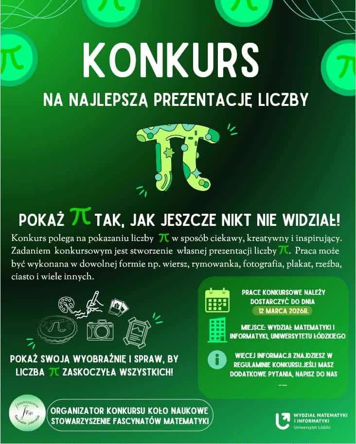 Zapraszamy również wszystkich studentów i miłosników matematyki do udziału w wyjątkowym Konkursie na Najlepszą Prezentację Liczby π!